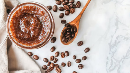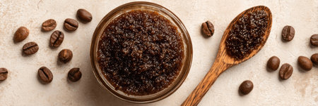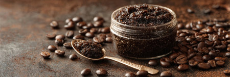 A glass jar filled with dark brown coffee scrub sits next to whole coffee beans and a wooden spoon, creating an inviting and natural aesthetic.