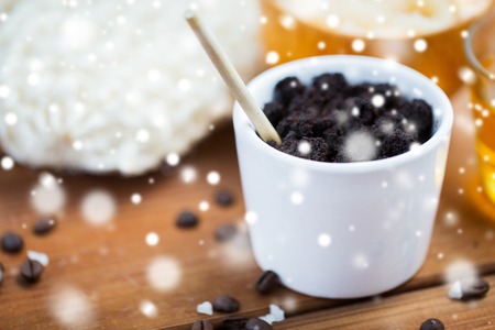 beauty, spa, bodycare, bath and natural cosmetics concept - homemade coffee scrub in cup on wooden table over snow