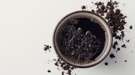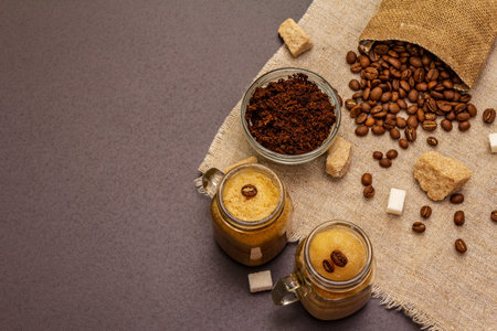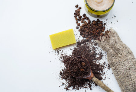 Coffee organic sugar scrub on a white background top view copy space, nutrition Wellness body skin care concept. Zero waste. Home Spa care.