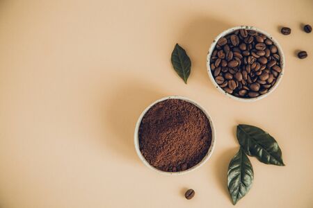 coffee beans and ground coffee in bowls with coffee tree leaf on a light background..copy space for your text