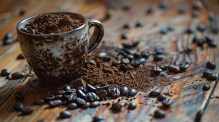 A rustic coffee cup filled with coffee powder, surrounded by scattered coffee beans. The wooden table background adds to the warm and earthy ambiance.