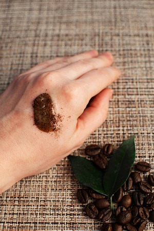Woman hand with scrub coffee grounds on table. Beauty and healthy care concept.