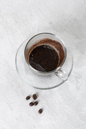 Coffee grounds in a glass mug on a concrete background