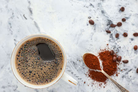 ground roasted coffee sprinkled on white background and white coffee cup close up close-up