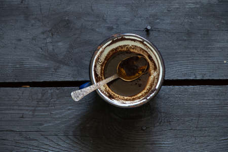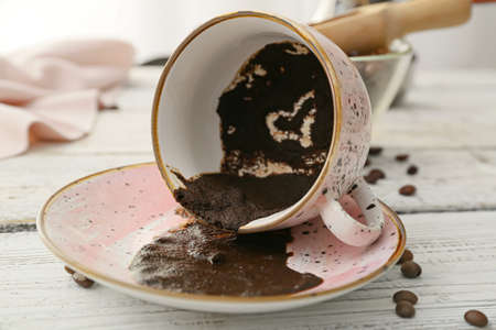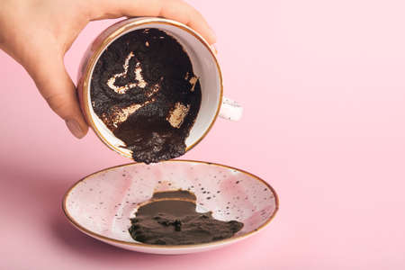 Cup with spent coffee grounds for fortune telling on wooden background