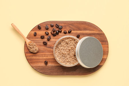Wooden board with jar of body scrub and coffee beans on color background