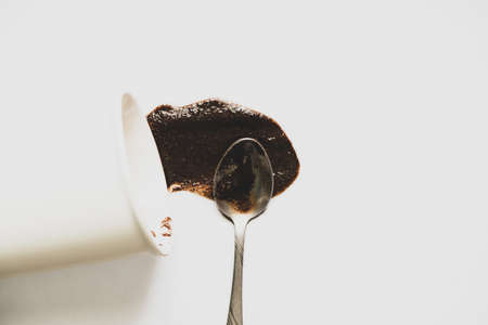 spilled coffee on white background, coffee grounds for background, stain on white background
