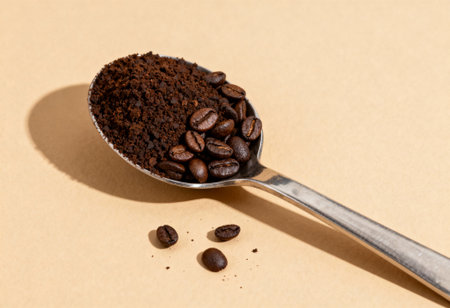 Heap of ground coffee with whole beans on metallic spoon, close up on textured beige background under bright natural light.