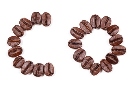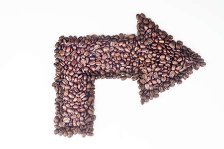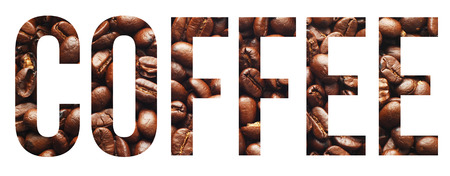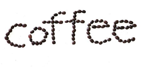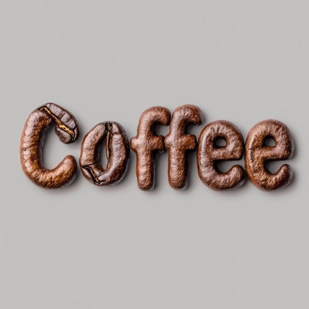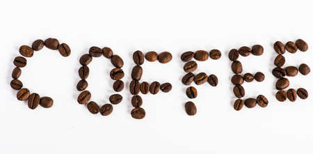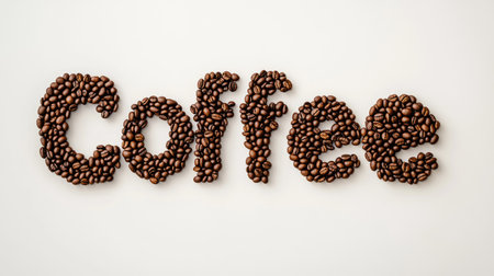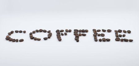 Coffee beans arranged to spell the word Coffee on a white background, with sharp details and vibrant brown tones.