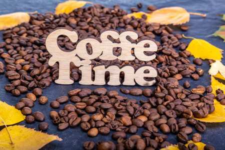 Texture background of coffee beans for design with the inscription coffee time. Coffee grains scattered on the table.