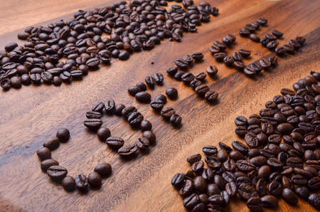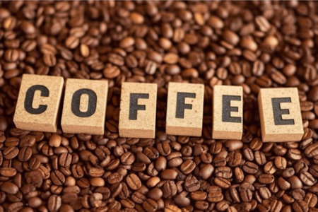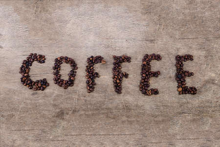 Close-up view of coffee beans creatively arranged to spell the word Coffee, showcasing rich textures and warm tones against a neutral backdrop, perfect for food lovers.