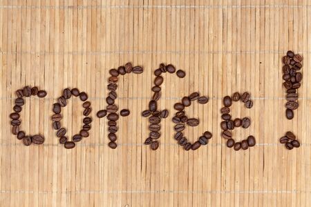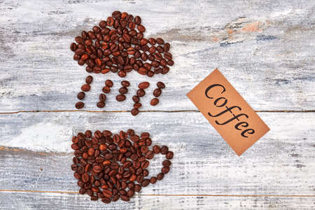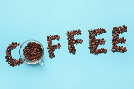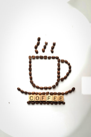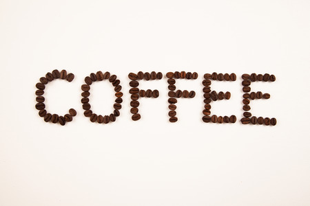 Coffee beans on a light background with a lined coffee beans of the word coffee with coffee cup. Coffee beans on a light background with the words coffee laid out from coffee beans with a coffee cup