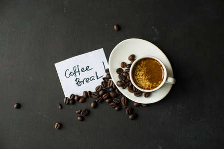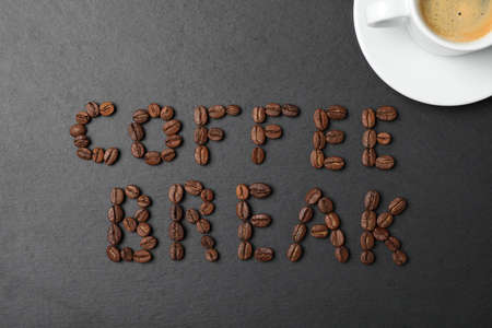 Phrase Coffee Break made with beans and cup of drink on black background, flat lay