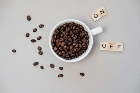Coffee beans in a white cup with the words on and off on pieces of paper on a wooden background. Top view. Morning coffee concept.