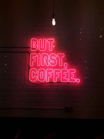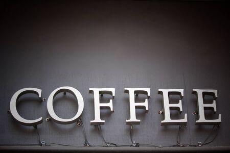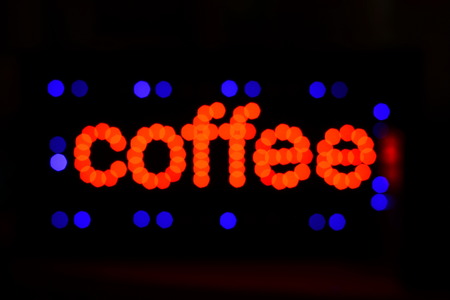 Boxed in light in the forms of letters reading the word coffee on a indoor wall