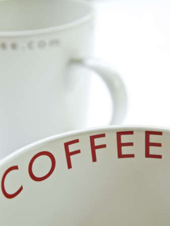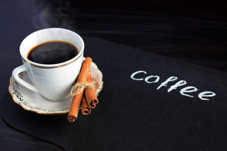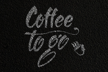 White ceramic cup of coffee and blackboard with inscription coffee writen colorful alphabet. Coffee break, morning awakening concept.