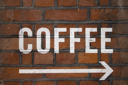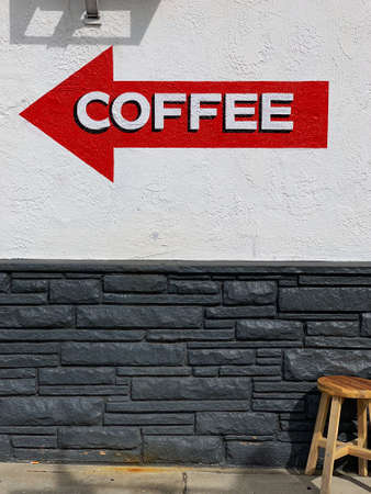 Coffee This Way illustration sign on brown surface. Cup of coffee icon and arrows pointing to the direction of a coffee shop. The sign is painted on a brown corrugated metal surface.