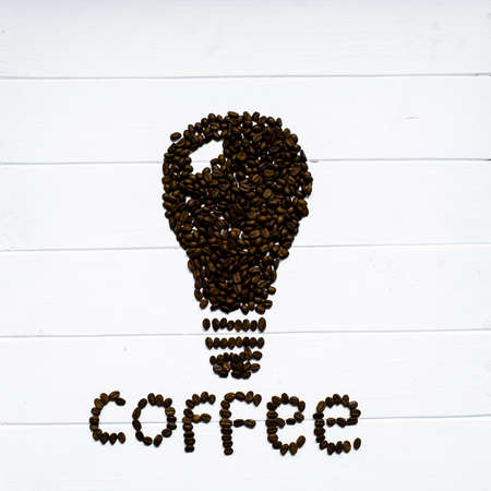 Creative still life of a light bulb made of roasted coffee beans with the inscription coffee.