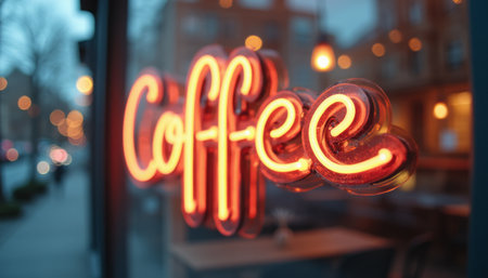 A vibrant neon sign spelling coffee illuminates the window of a charming café, creating an inviting atmosphere. The soft glow of the sign contrasts beautifully with the blurred background, evoking a sense of warmth and comfort perfect for coffee lovers.