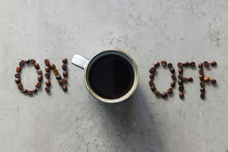 The photo showcases on and off spelled out with coffee beans, with a cup of freshly brewed black coffee placed between them. It serves as a metaphor for igniting the mind, body, and individual to spur action.