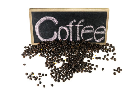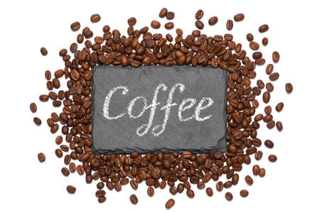 stone serving board with chalk handwritten sign and coffee beans on white background
