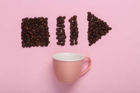 Coffee beans in the shape of start, stop, pause icons of media player and cup on pink background. top view