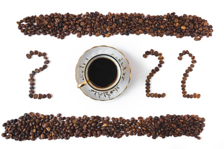 Coffee beans, coffee cup and 2022 coffee bean name on a white background. Christmas and New Year concept.