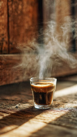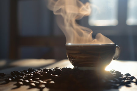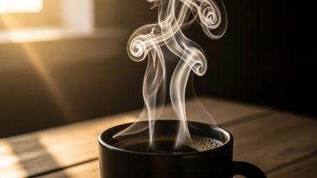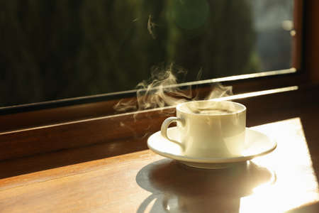 Cup of hot coffee with steam on wooden table in morning sunlight