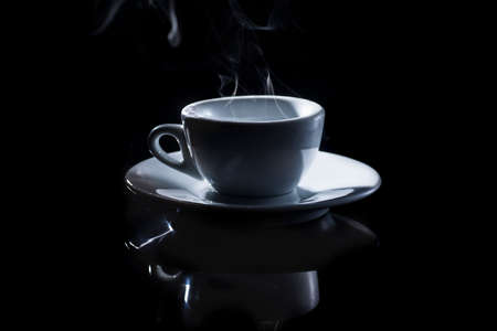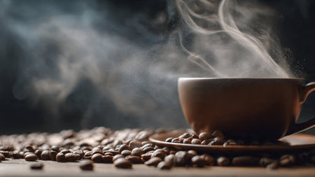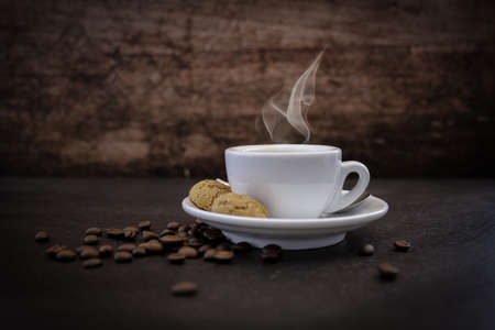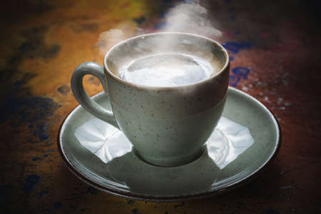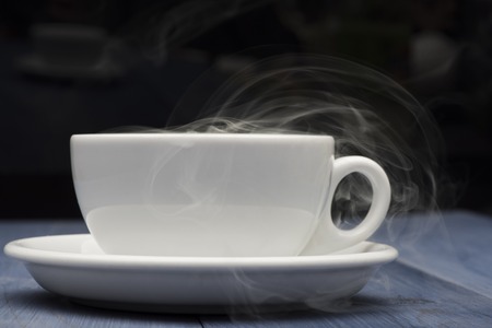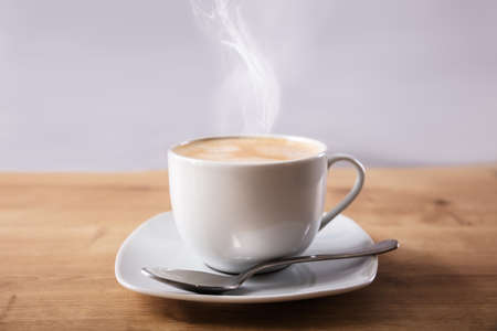 cup of hot coffee with foam and smoke on table in the morning. copyspace for your text