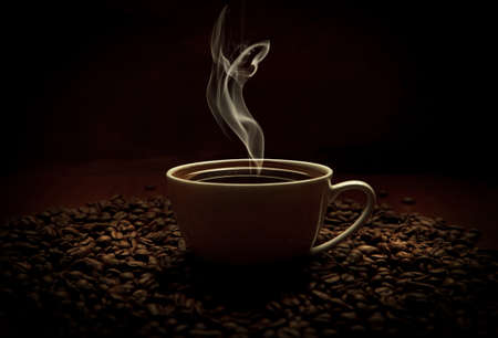 An illuminated coffee cup placed on the black background. Horizontal studio shot.