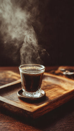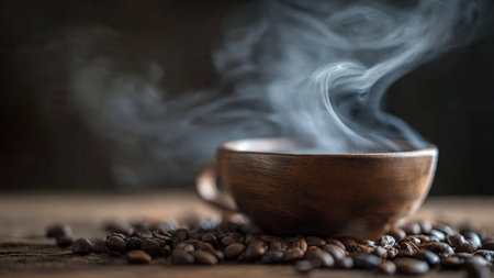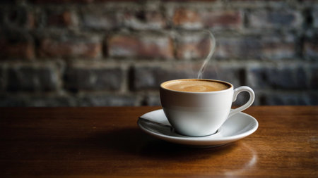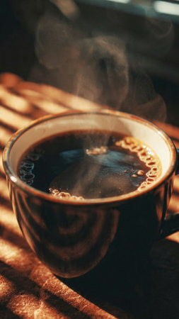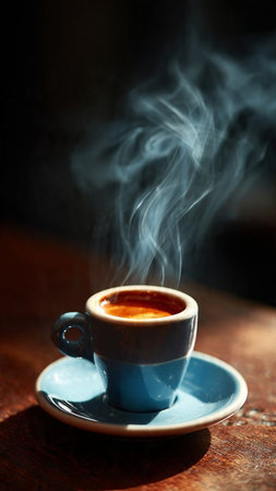 A cup of freshly brewed coffee sits on a rustic wooden table, with steam rising from its surface.