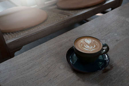 cup of coffee latte art on the wooden desk in coffee shop cafe with vintage color tone filter background