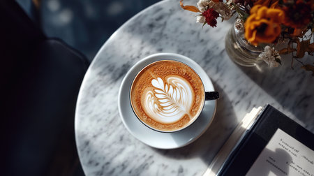 A beautiful overhead shot of a latte with intricate foam art, placed on a marble table with a book and a vase of flowers in the background, creating a relaxing vibe