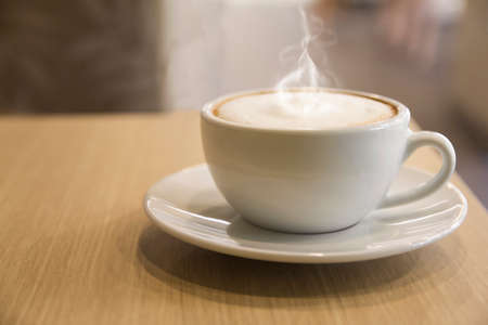 cup of hot coffee with foam and smoke on table in the morning. copyspace for your text
