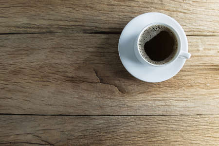 Top view,Hot coffee cup on glass cup on wooden table background.
