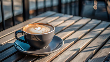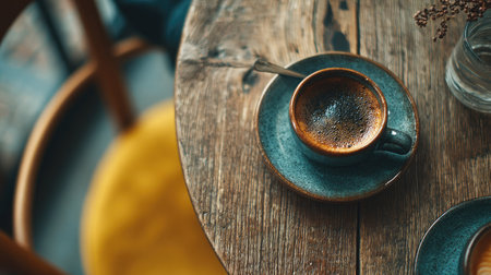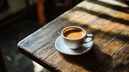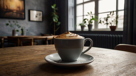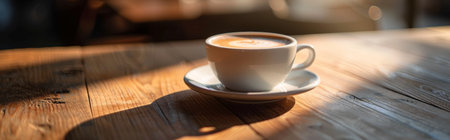 This image captures a serene moment featuring a cozy coffee cup placed on a rustic wooden table. The warm lighting invites relaxation, making it perfect for caf