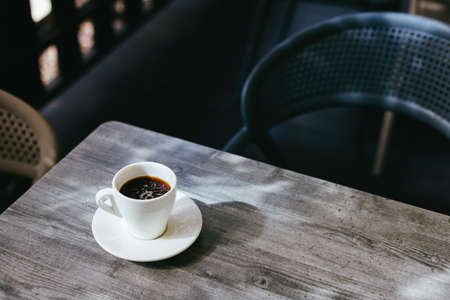 Cup of black coffee on a rustic wooden table in a street cafe. Place for text.