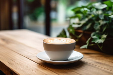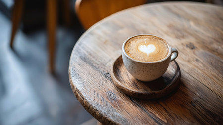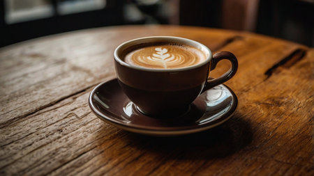 A close-up of a cup of coffee with beautiful latte art served on a wooden table in a cozy cafe