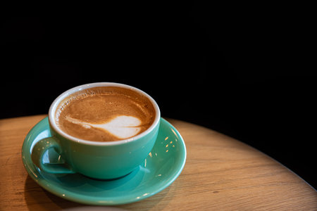 Green blue Coffee cup with cafe latte on wood table in coffee shop, stock photo, coffee background