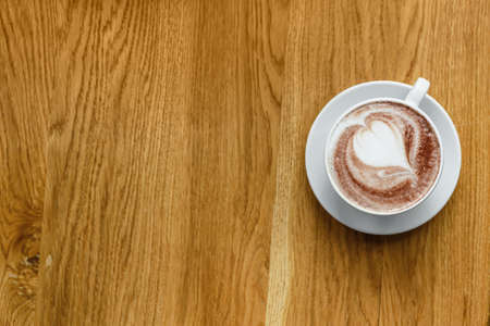 Hot cocoa with heart shape latte art in white cup on wooden table.