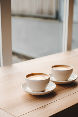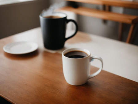 An AI generated illustration of two ceramic coffee cups on a wooden table