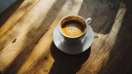 A white cup of coffee with intricate latte art on a wooden table, illuminated by warm natural light, creating a cozy and inviting ambiance.