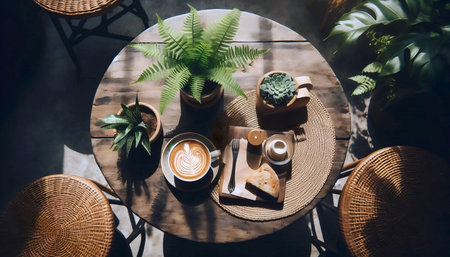 A close-up shot of a creamy latte in a ceramic mug, featuring intricate fern-leaf latte art. The mug sits on a warm, polished wooden table next to a folded linen napkin, bathed in natural sunlight that creates inviting shadows and highlights, evoking a cozy and peaceful coffee break atmosphere in a cafe or home setting.