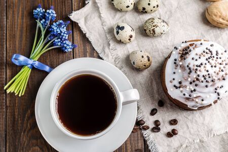 Easter breakfast with coffee, cupcake and boiled eggs.