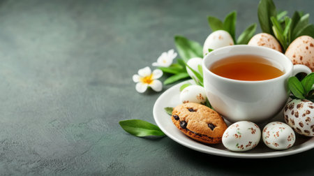 Fresh tea in a cup, surrounded by decorated eggs and daisies, arranged on a pastel blue background. Concept of springtime and Easter. copy space