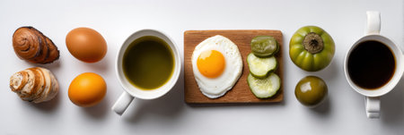 A variety of breakfast items are artistically arranged on a white surface, featuring eggs, vegetables, and beverages ready to enjoy.