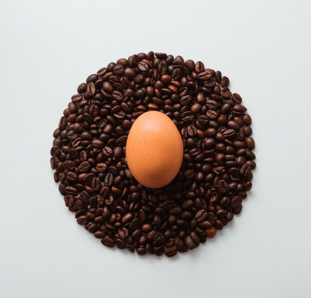 Uncooked egg and coffee roasted beans on white background. Flat lay, top view. Minimal Easter holiday composition. Food and drink concept.