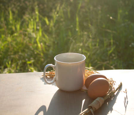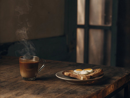 Warm cup of coffee and sunny-side-up egg served on a rustic table outdoors at a charming cafe patio table in the warm sunlight