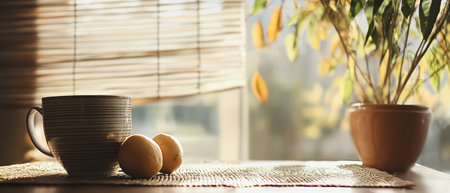 A cozy kitchen table is bathed in warm morning light, featuring a cup, two lemons, and a potted plant nearby, creating a tranquil and inviting atmosphere.
