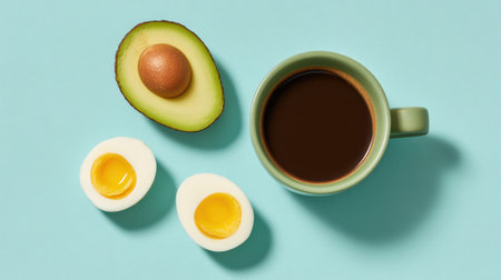 Bright and inviting image featuring a fresh avocado, soft boiled egg halves, and a steaming cup of coffee on a blue background, perfect for a healthy breakfast concept.